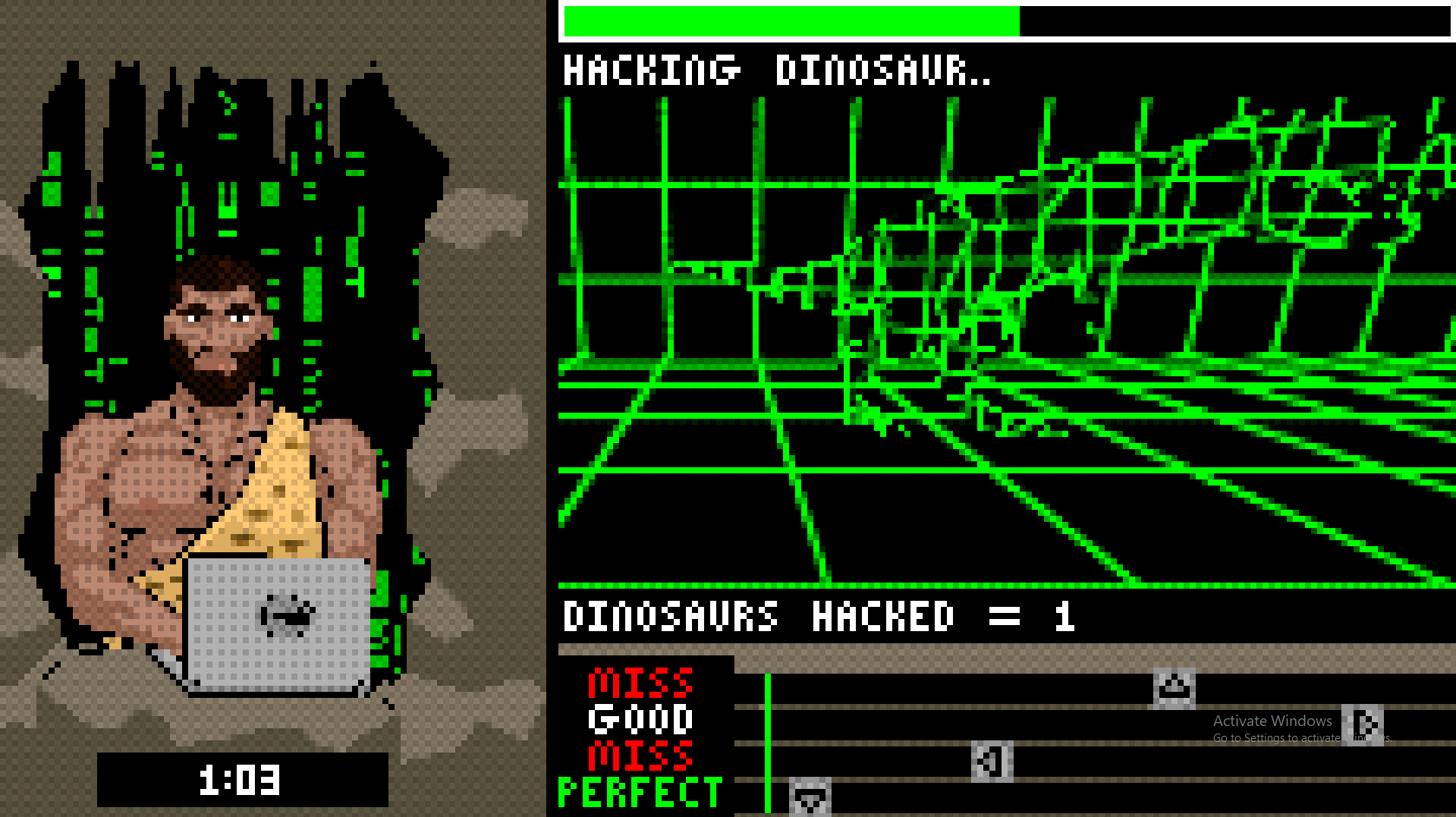 Rhythm based game where you play as a stone age hacker who must avenge his family by hacking into the dinosaur mainframe to make the dinosaurs go extinct.